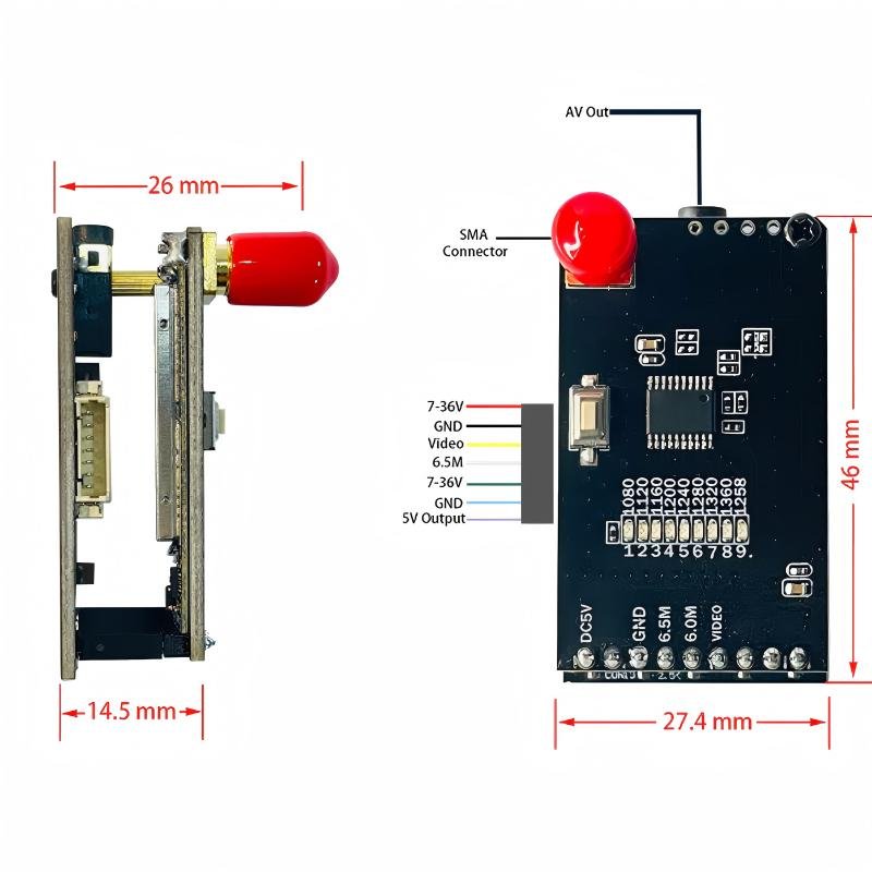Compact 1.2GHz FPV video receiver with 9 channels across 1050–1380MHz. High sensitivity at -95dBm with wide voltage input — designed as the ideal companion receiver for 1.2GHz long-range FPV systems.